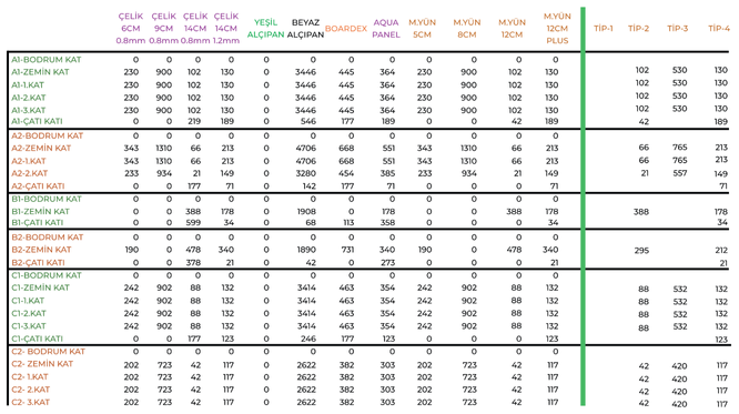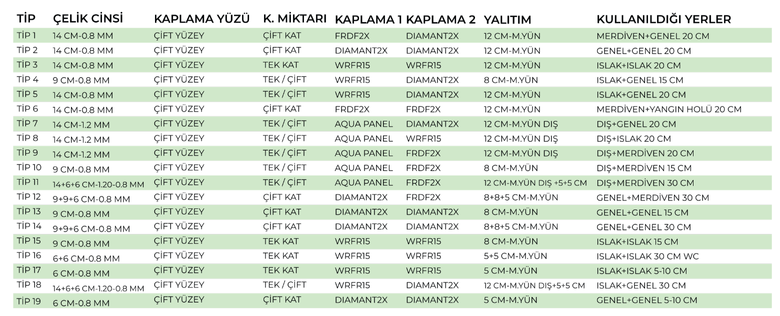 Her projede duvar tip numaraları ve cinsleri farklılık gösterebilir.